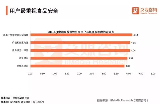 iiMedia Research(艾媒咨詢)數據顯示,在眾多因素的評分中(以5分為滿分),受訪在線外賣用戶最看重商家環境及食品安全檔案。其次,其他用戶的評分、評價,以及商家的價格與優惠力度也較為重要。