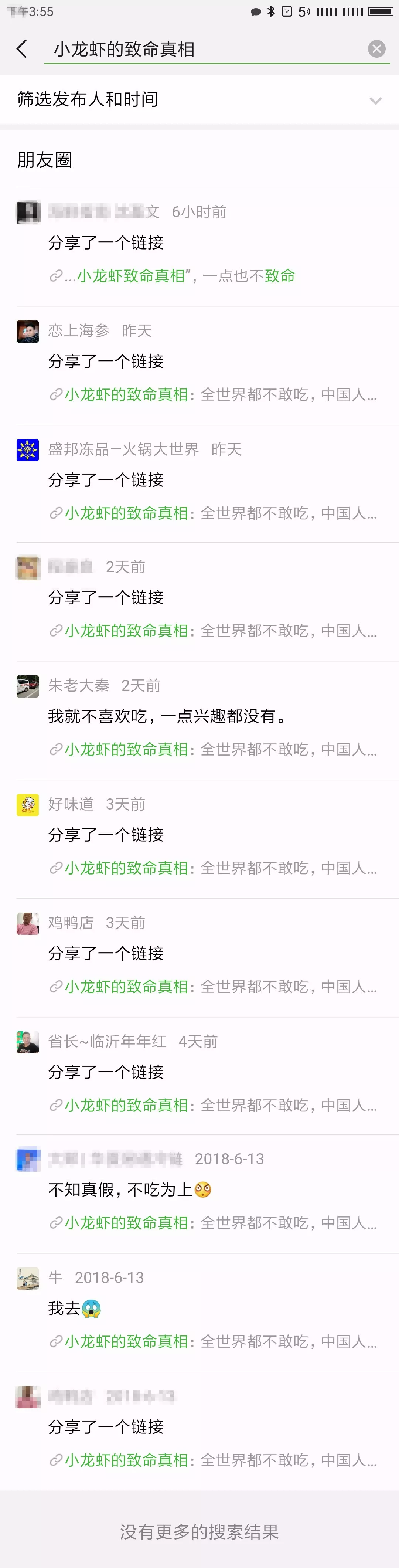 最近在朋友圈有一篇很熱的網文在到處流傳,題目叫做《小龍蝦的致命真相:你可能永遠不知道》,這篇文章被眾多的公號來回轉載,已經很難找到原出處在哪里,但傳播確實很廣,隨便在朋友圈里搜一下,就是這個結果。