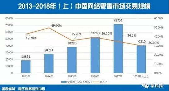 盡管在網(wǎng)民規(guī)模增速放緩、人口紅利消失等因素的影響下,網(wǎng)絡(luò)零售市場交易規(guī)模增速放緩,但是參考上半年的增長幅度數(shù)據(jù),結(jié)合2013年——2018年(上)國內(nèi)網(wǎng)絡(luò)零售市場整體交易規(guī)模增速數(shù)據(jù)來看,2018年全年的網(wǎng)購消費總額會再次拔高到一個新的高度——突破8萬億。