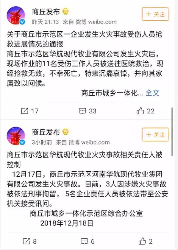 12月17日,河南商丘城鄉一體化示范區華航現代牧業有限公司廠區發生火災。據商丘市人民政府新聞辦通報,火災已致11人死亡。