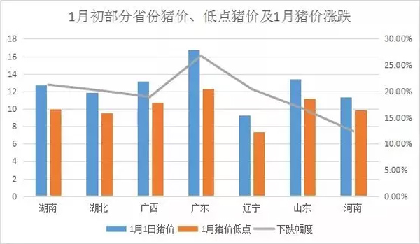 廣東豬價最高,遼寧豬價最低,價差達到7.5元/公斤。廣東1月初豬價與1月低點豬價相差4.5元/公斤。也是圖中列舉省份中,下跌幅度最大的,下跌幅度為26.79%。遼寧、湖南、湖北下跌幅度也大,跌幅在20%以上。