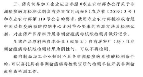 第三,豬肉制品加工企業(yè)需對生豬原料開展非洲豬瘟病毒核酸檢測并做好記錄。