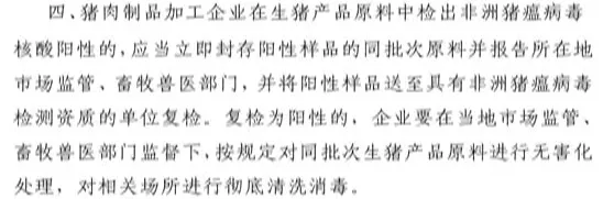 第四,公告明確,豬肉制品企業(yè)在檢出生豬原料中非洲豬瘟病毒核酸陽性的,應該如何處置。