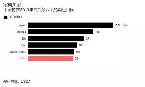 數據顯示,2019年中國的家禽進口量將增長68%達到57.5萬噸,中國將在2019年成為全球第六大雞肉進口國。