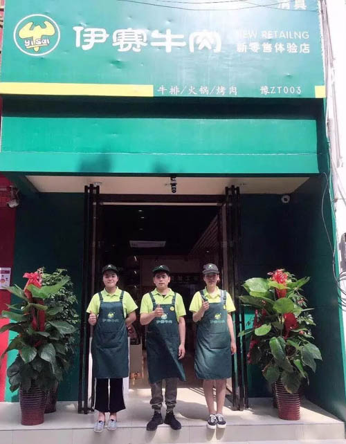 2019年5月18日,標(biāo)號(hào)豫ZT003號(hào)的伊賽牛肉直營(yíng)新零售體驗(yàn)店三號(hào)店正式開業(yè)。綠色主題招牌下記錄著三個(gè)關(guān)鍵詞:牛排/火鍋/烤肉。