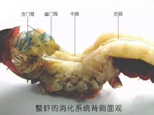 該傳言屬于信口開河類型,對小龍蝦基本無知。小龍蝦整個身體由頭胸部和腹部兩部分組成,頭胸部外有眼睛、觸須、性器官,內有鰓、肝胰腺(蝦黃)、胃等內臟組織,腸道位于腹部。小龍蝦的消化系統由口器、食道、胃、腸、肝胰臟、直腸及肛門組成。食物經賁門胃進一步磨碎后,經幽門胃過濾進入腸,在頭胸部的背面,腸的兩側各有一個黃色分支狀的肝胰臟,肝胰臟有肝管與腸相通。腸的后段細長,位于腹部的背面,其末端為球形的直腸通肛門,肛門開口于尾節的腹面。在胃囊內,胃外兩側各有一個白色或淡黃色,半圓形紐扣裝的鈣質磨石,蛻殼前期和蛻殼期較大,蛻殼間期較小,起著鈣質的調節作用。肝胰臟較大,呈黃色或暗橙色,由很多細管狀構造組成,有管通中腸。肝胰臟除分泌消化酶幫助消化食物外,還具有吸收貯藏營養物質的作用。