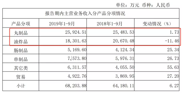 丸制品和油炸品,一直是惠發食品最大的兩個產品品類,但前三季度,它們的增幅極低,分別為1.73%和-11.46%。油炸品還出現了負增長。