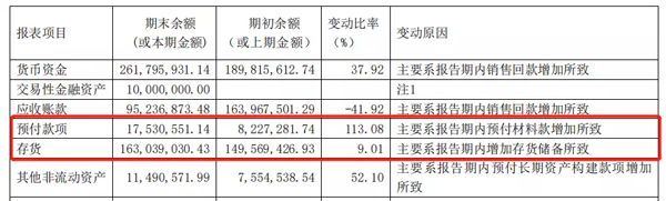 上圖為惠發食品公布的部分報表項目,從中可以看到,預付款項增幅較大,為113.08%?;莅l食品解釋,這是因為報告期內預付材料款增加所致。