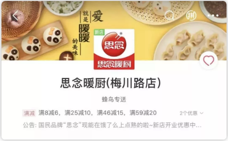 8月8日,思念食品通過官方微信宣布,攜手餓了么推出外賣餐飲店“思念暖廚”,與此相似的是,“灣仔碼頭”的水餃外賣店也同時出現(xiàn)。此外,冷凍燜面、煎餃類產(chǎn)品也被用作外賣點(diǎn)心。