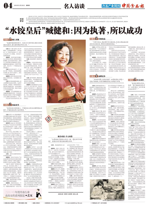 2010年3月,報社組織“冷凍食品行業杰出女性系列報道”,其中的一篇便是對臧健和的專訪。