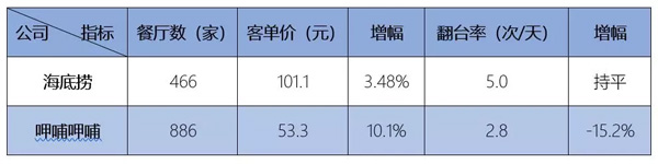 另外,客單價和翻臺率是評價餐飲企業的兩項重要指標。2018年海底撈客單價101.1元,同比微增;呷哺呷哺的客單價為53.3元,同比增幅超過10%。