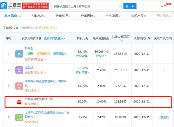 冷食君在企查查上查詢到,鍋圈供應鏈(上海)有限公司成立于2019年07月11日,部分股權結構如下,其中的成都全益食品有限公司即為三全食品的子公司。