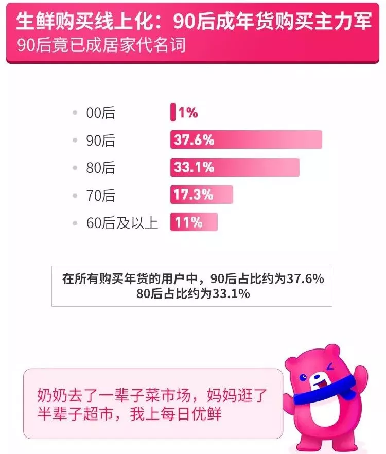 事實(shí)上,90后成為生鮮年貨消費(fèi)占比最高的群體并無(wú)意外。90后是與互聯(lián)網(wǎng)共同成長(zhǎng)的一代,對(duì)互聯(lián)網(wǎng)電商渠道有著天生的親近感。隨著90后步入婚姻生活,購(gòu)買生鮮成為剛需,他們不再如父輩選擇線下超市、菜市場(chǎng)作為生鮮年貨購(gòu)買地,而是選擇精選品類、即時(shí)送達(dá)的生鮮電商作為年貨購(gòu)買渠道。