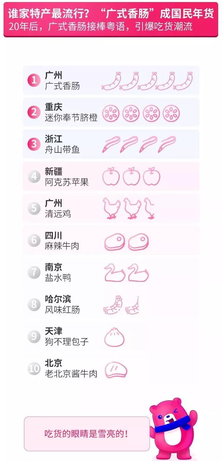 數(shù)據(jù)顯示,在所有地方的特產(chǎn)中,廣式香腸憑借銷量冠軍成為當(dāng)之無(wú)愧的“國(guó)民年貨”。此外,重慶奉節(jié)臍橙、浙江舟山帶魚(yú)、新疆阿克蘇蘋果、廣州清遠(yuǎn)雞緊跟其后。