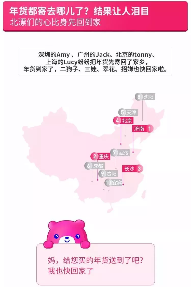 年貨比人先到家已經(jīng)成為很多“漂”們的新選擇。在外辛苦工作一年的“漂們”,思鄉(xiāng)情緒在春節(jié)前集中爆發(fā),他們大多數(shù)會(huì)選擇提前為遠(yuǎn)方的親人挑選年貨,把愛(ài)和牽掛郵寄回家。數(shù)據(jù)顯示,超過(guò)9成外地工作的用戶會(huì)線上購(gòu)買年貨禮盒寄回家鄉(xiāng),其中濟(jì)南、長(zhǎng)沙、重慶成為收到年貨禮盒最多的城市。
