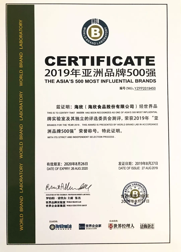 海欣食品蟬聯《亞洲品牌500強》